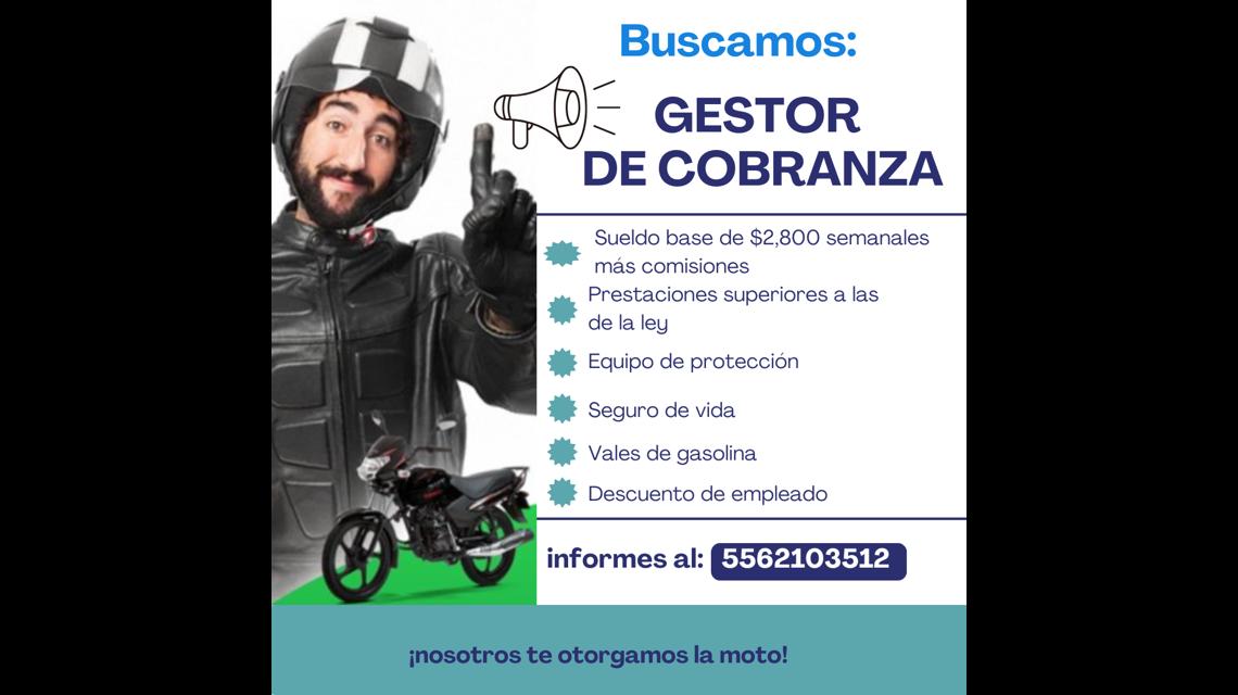 - Experiencia en cobranza domiciliaria (preferentemente), atención a clientes o bien, como repartidor a domicilio en moto.