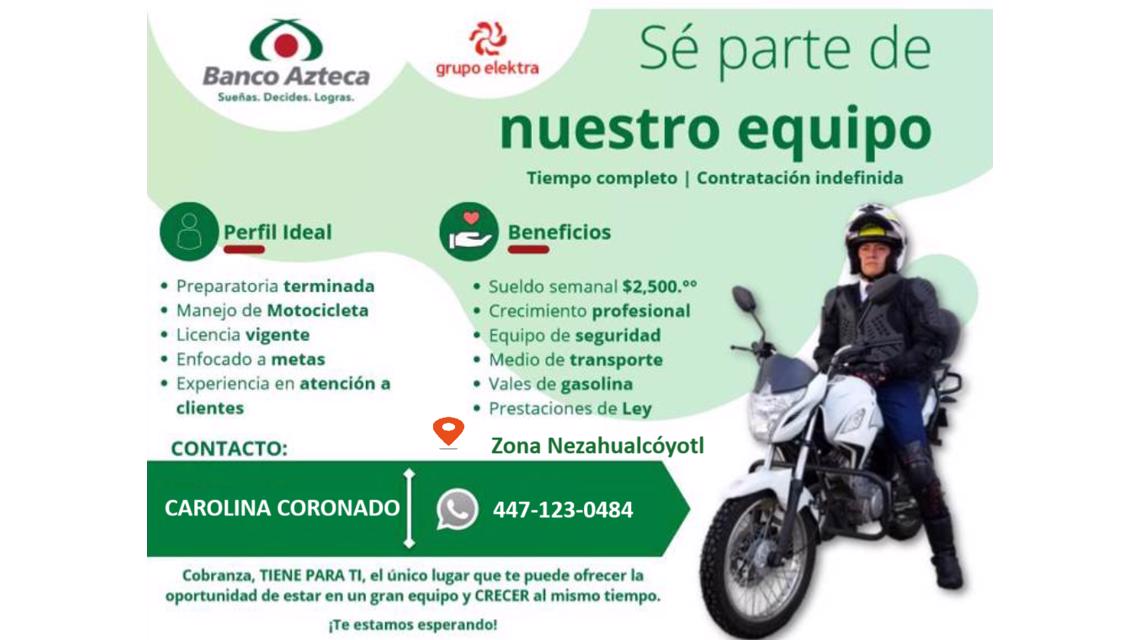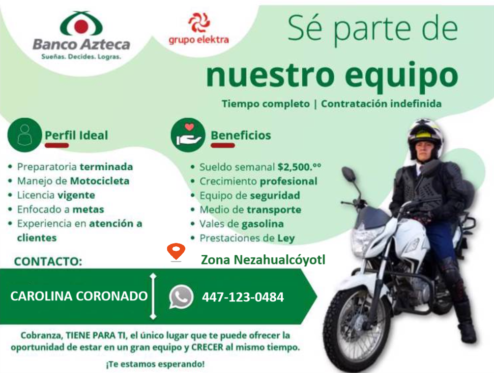 Requisitos: experiencia en cobranza, manejo de motocicletas, licencia vigente, atención al cliente, capacidad de visita a clientes.